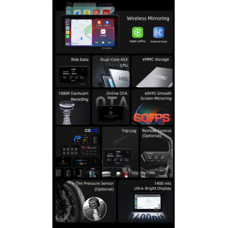 Chigee MFP0127 – XR-2 je kompaktný a výkonný jazdný systém navrhnutý pre motocyklistov, ktorí hľadajú cenovo dostupné riešenie bez kompromisov v oblasti funkčnosti a kvality. Systém je vybavený 4,3-palcovým displejom, ktorý umožňuje bezdrôtové zrkadlenie smartfónu, a duálnou prednou a zadnou kamerou pre úplné zaznamenávanie jazdy