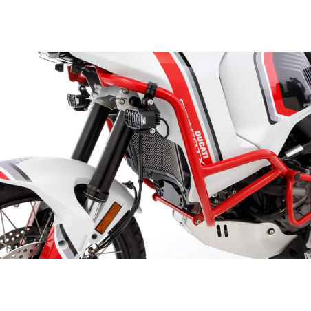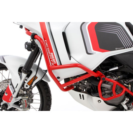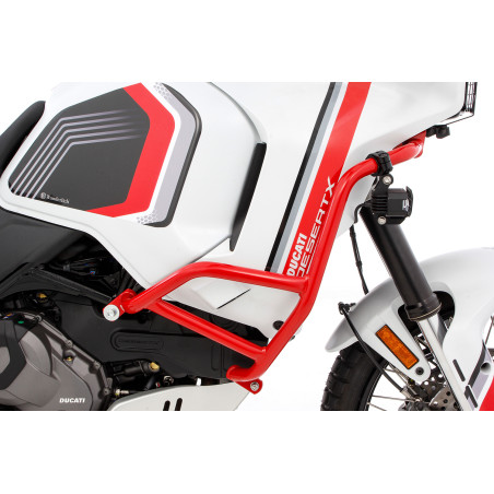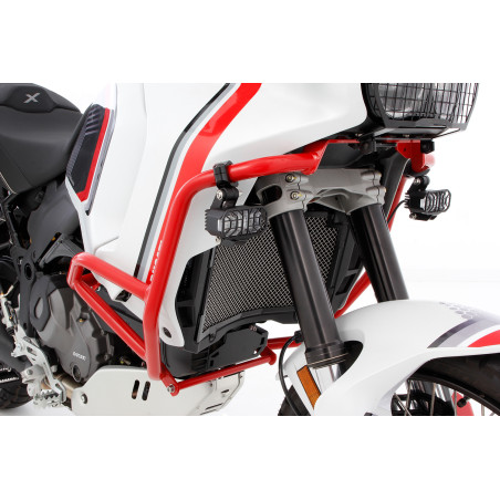 Odporúčame preventívnu ochranu citlivého obkladu, pretože pri manévrovaní v garáži alebo na verejnom parkovisku hrozí jeho poškodenie. Náš držiak kapotáže spoľahlivo chráni kapotáž a oblasť na boku chladiča, čím znižuje riziko drahého poškodenia. V prípade pádu alebo prevrátenia sa pôsobiace sily optimálne rozložia cez ochrannú tyčovú konštrukciu na pružné upevňovacie body, čím sa redukujú silové a momentové špičky. Vizuálne sa ochranná lišta kapotáže dokonale integruje do línie letu DesertX a podčiarkuje jej výrazný vzhľad. Ochranná lišta kapotáže je vyrobená z 25 milimetrovej presnej oceľovej rúrky. Skladá sa z dvoch rúrkových segmentov, ktoré sú vytvarované na CNC ohýbačkách rúr a následne úhľadne zvarené. Zloženie je jednoduché.