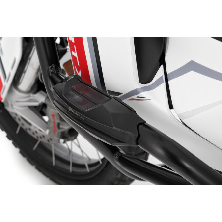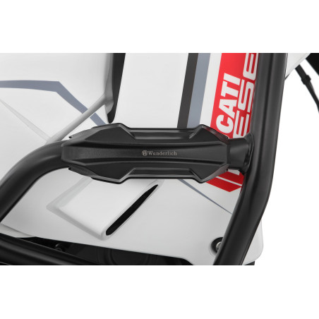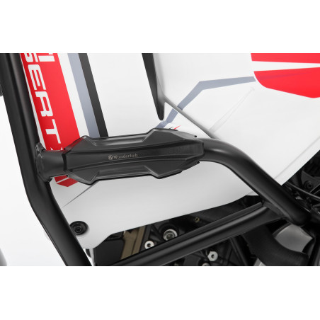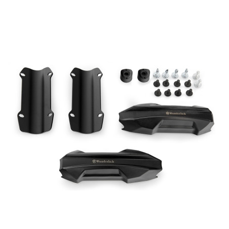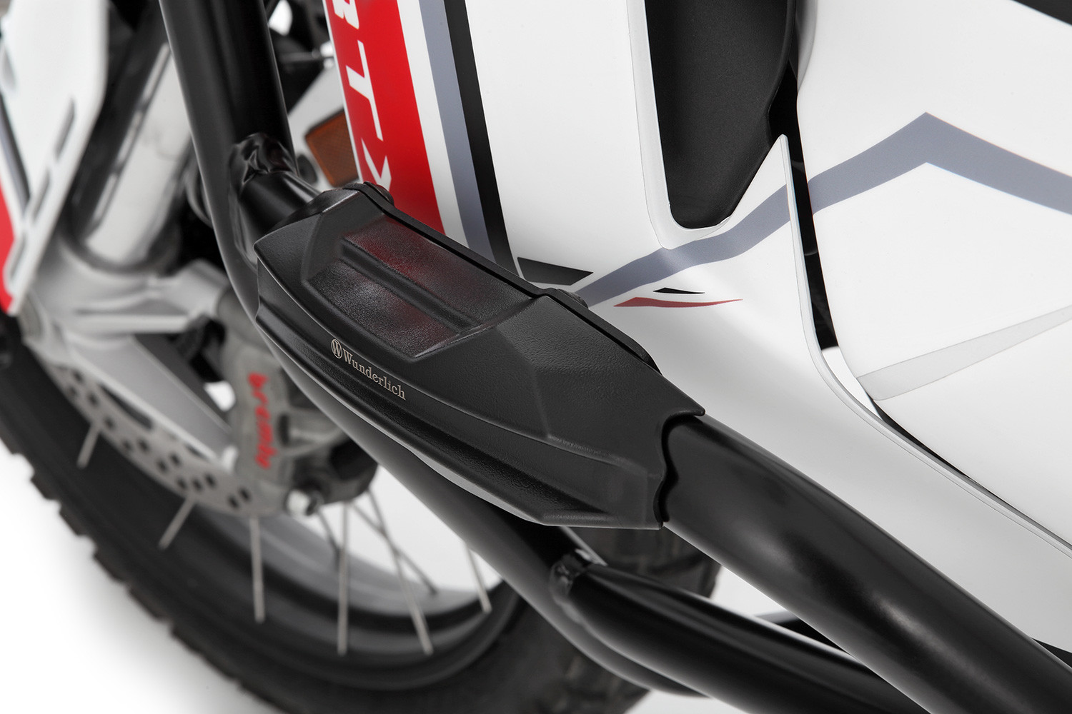 Naše praktické a užitočné chrániče vyrobené z odolného plastového materiálu zabraňujú vo väčšine prípadov poškriabaniu ochranných tyčí. Pomocou pevnej hliníkovej svorky a štyroch skrutiek ich možno bezpečne a spoľahlivo pripevniť na takmer akúkoľvek ochrannú lištu s priemerom rúrky 25 milimetrov*, či už ide o motor, kapotáž alebo ochranné lišty nádrže. Voliteľne je možné namontovať prídavné mechanické zariadenie proti prekrúteniu (objímka sedla). Toto je zahrnuté.