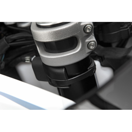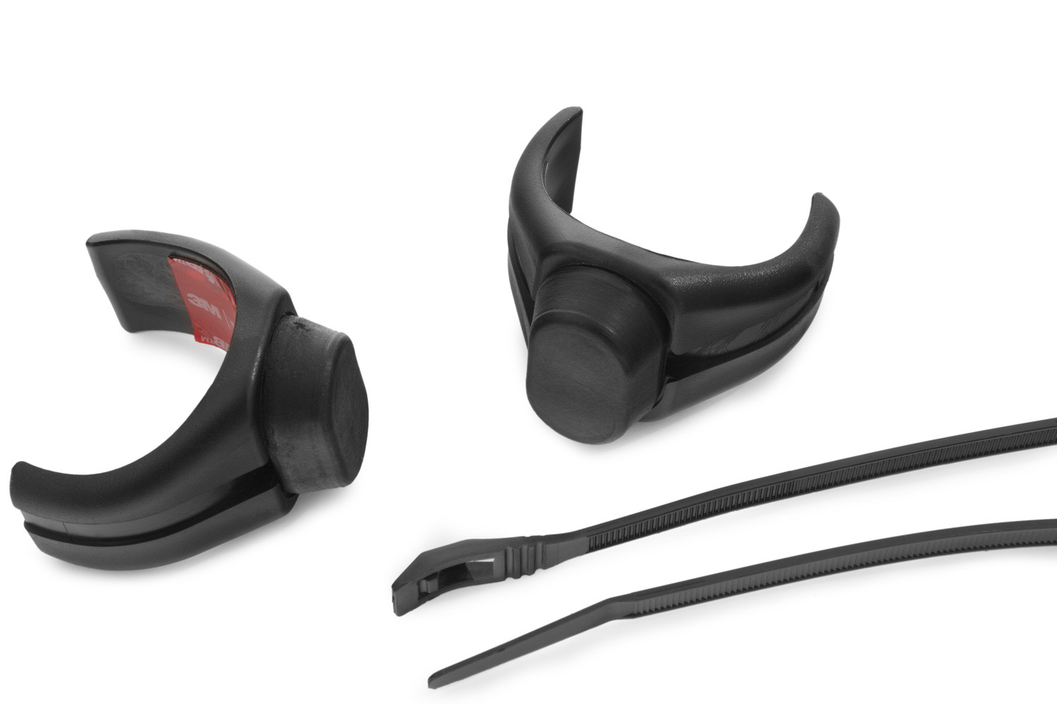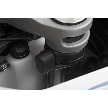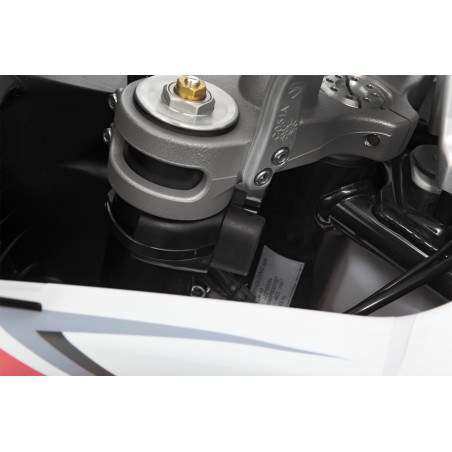 Inštalácia dvoch obmedzovačov dorazu riadenia je mimoriadne jednoduchá: Najprv sa pripevnia na tyče vidlice pomocou skrytej, kvalitnej lepiacej pásky 3M a tiež sa pripevnia pomocou robustnej káblovej pásky, ktorá diskrétne zapadne do poskytnutej obvodovej drážky.