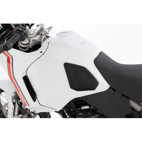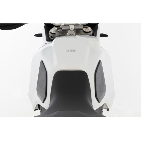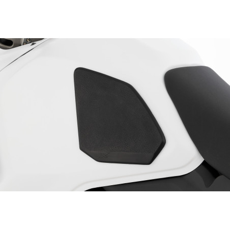 Sada ochranných podložiek nádrže v dizajne X je presne prispôsobená dizajnu stroja. Podložky pre pravý a ľavý bok nádrže účinne chránia kontaktné body na nádrži pred poškriabaním, odieraním alebo odieraním. Zároveň zlepšujú priľnavosť kolena a vďaka zvýšenej priľnavosti poskytujú citeľne lepší kontakt s motocyklom pri jazde. To výrazne zvyšuje zážitok z jazdy a potešenie z jazdy. Vankúšiky sú vyrobené z kvalitného, nekĺzavého čierneho plastu, ktorý tlmí nárazy a má jemne zrnitú textúru. Vankúšiky sú samolepiace a ľahko sa nanášajú. S vyvýšeným logom X-Design.