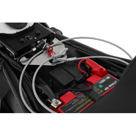 Pravdepodobne najbezpečnejší a ľahko použiteľný zámok na prilbu. Robustná základňa našej ochrany proti krádeži prilby vyrobená z hliníka je bezpečne pripevnená pod sedadlom. Dĺžka lana je taká, že je možné zaistiť až dve prilby. Drôtené lano má priemer 4 mm.