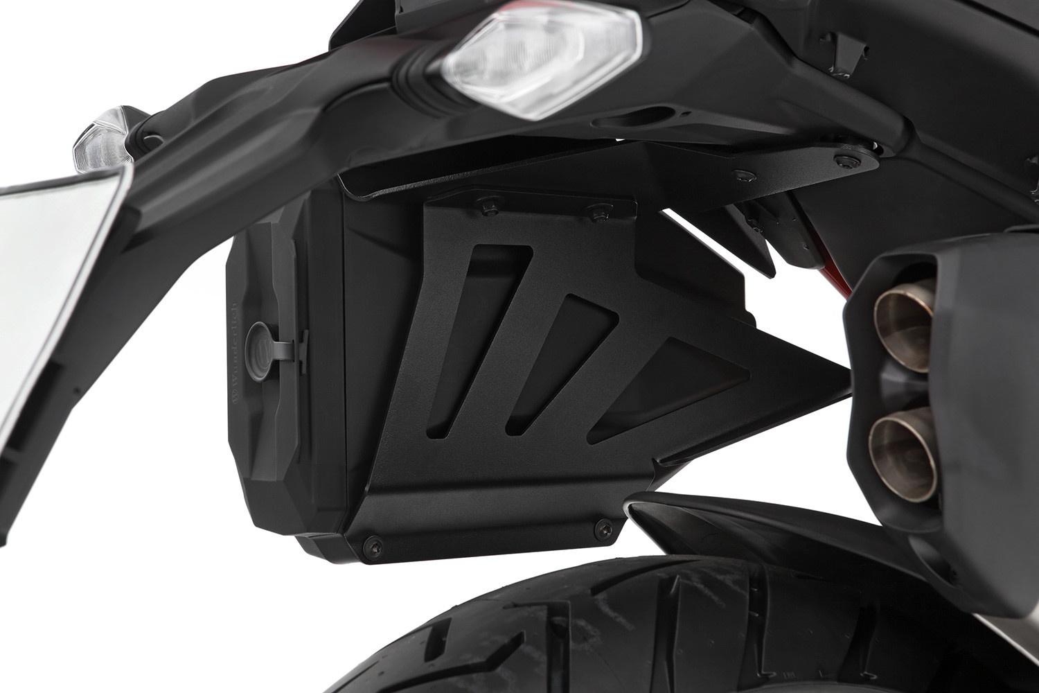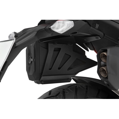 Naša na mieru vyrobená uzamykateľná skrinka na náradie ponúka ďalší úložný priestor pre všetky druhy užitočných drobností a je vhodná pre modely bez kufríka. Funkčný, robustný box je vybavený štyrmi pevnými závitovými vložkami a je bezpečne pripevnený na ľavej strane vozidla pomocou dvoch držiakov. Veko je zabezpečené proti strate. Box vyrobený z kvalitného plastu je vodeodolný a extrémne robustný. Dodávame ich s príslušnou pridržiavacou sadou a kódovateľnou uzamykacou vložkou.
