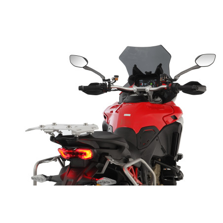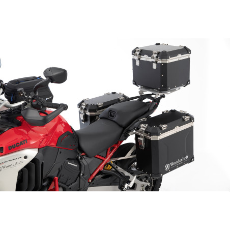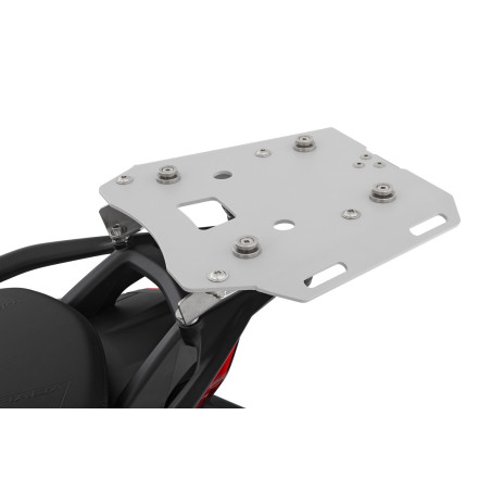 Pevný nosič horného kufra, starostlivo vyrobený z nehrdzavejúcej ocele, šikovne kopíruje líniu sedadla spolujazdca a dokonale tak zapadá do celkového dizajnu stroja. Prípadne sa dá použiť aj ako nosič batožiny. Diskrétna, no robustná konštrukcia je vzadu priskrutkovaná k štyrom vhodným existujúcim bodom rámu s konzolami špecifickými pre daný model, ktoré sú tiež vyrobené z nehrdzavejúcej ocele. Vrchný kufrík možno rýchlo zložiť, rozložiť a bezpečne uzamknúť. Zámok zaisťuje bezpečné uchytenie bez vôle, bez ohľadu na povrch vozovky.