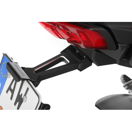 Prestavbová sada robí z vizuálne dominantného - niektorí ho niekedy opisujú ako objemný - dlhý kryt kolesa zbytočným a nahrádza kryt kolesa a držiak ŠPZ zmenšeným, harmonicky integrovaným, kvalitne pôsobiacim športovým variantom. Presne padnúci zadný panel v tvare škrupiny našej stavebnice uzatvára otvor na dne, ktorý vznikne pri odstránení pôvodného krytu kolesa. Je tiež základom pre uchytenie nášho športového držiaka ŠPZ zredukovaného na to najnutnejšie, ktorého nadstavec je vyrobený z frézovaného hliníka. Uhol sklonu ŠPZ je samozrejme nastaviteľný a pripravené sú úchyty pre indikátory príslušenstva. Samotný držiak ŠPZ je vyrobený z nehrdzavejúcej ocele. Pripravené sú adaptérové káble pre nekomplikované, pohodlné elektrické pripojenie smerových svetiel a priloženého LED osvetlenia ŠPZ (s označením E). Môžu byť skryté v poskytnutých káblových kanáloch, a preto zostávajú neviditeľné. V neposlednom rade je súčasťou dodávky požadovaný (odnímateľný) reflektor.