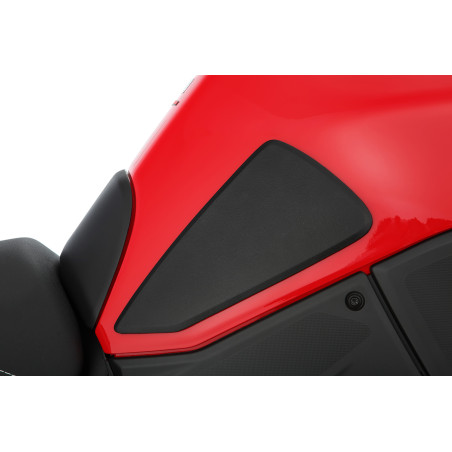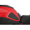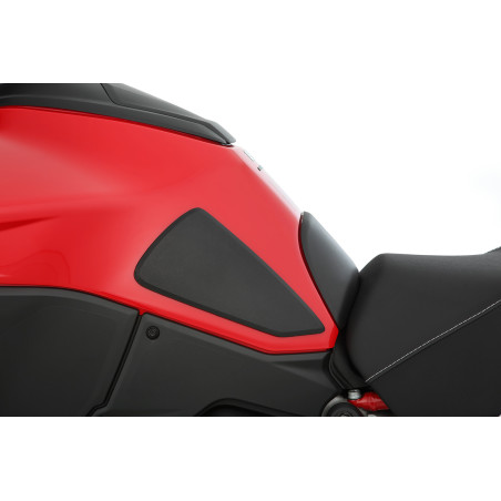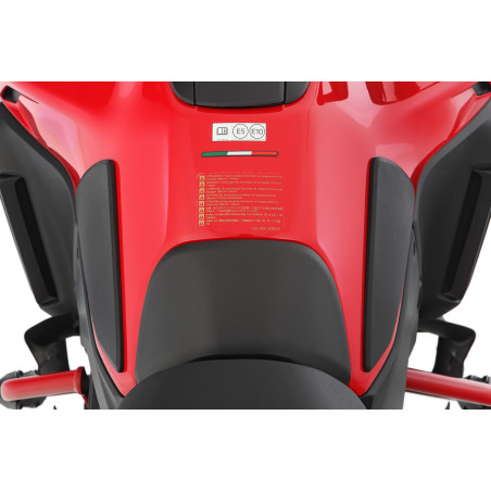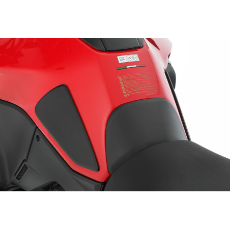 Sada ochranných podložiek nádrže je presne prispôsobená dizajnu a líniám Ducati Multistrada V4. Podložky pre pravý a ľavý bok nádrže účinne chránia kontaktné body na nádrži pred poškriabaním, odieraním alebo odieraním. Zároveň zlepšujú priľnavosť kolien a vďaka zvýšenej priľnavosti poskytujú citeľne lepší kontakt s motocyklom pri jazde. To výrazne zvyšuje zážitok z jazdy a potešenie z jazdy. Vankúšiky sú vyrobené z kvalitného, protišmykového čierneho plastu, ktorý tlmí nárazy a má jemne zrnitú textúru. Vankúšiky sú samolepiace a ľahko sa nanášajú.