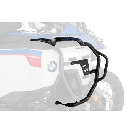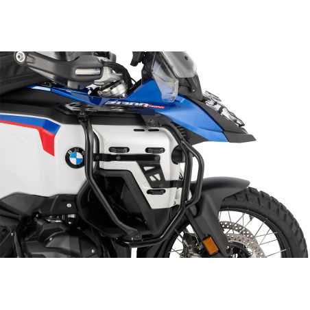 Táto ochranná lišta nádrže Wunderlich ULTIMATE je špeciálne navrhnutá pre dobrodružnú jazdu a spoľahlivo chráni nielen nádrž, ale aj kapotáž, predstavec a vysoko rizikové jednotky vodného chladiča. V kombinácii s ochranou proti prevráteniu Wunderlich vytvára premyslenú všestrannú koncepciu ochrany pre pasívnu bezpečnosť: V prípade pádu alebo pádu sa sily, ktoré naň pôsobia, optimálne rozložia na nosné upevňovacie body prostredníctvom konštrukcie ochrannej tyče, čím sa znížia špičky sily a krútiaceho momentu. Vizuálne sa nárazník integruje do dizajnu Adventure a podčiarkuje jeho nápadný vzhľad. Ochranná lišta nádrže je vyrobená z kompozitu 25 milimetrovej presnej oceľovej rúrky. Rúrkové segmenty sa formujú na CNC ohýbačkách rúrok a potom sa úhľadne zvárajú.