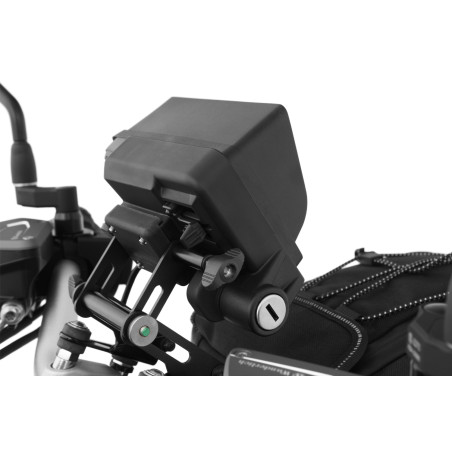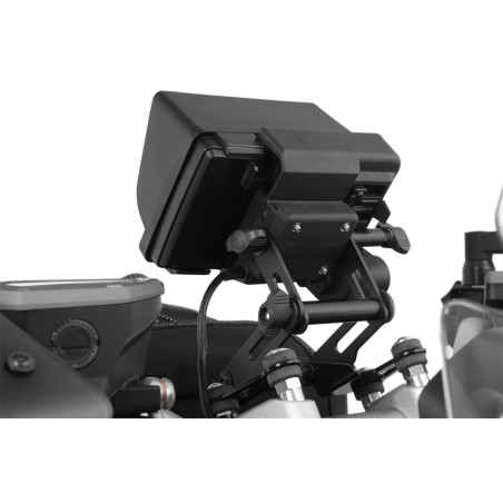 Vyvinuli sme tento dômyselný, nastaviteľný adaptér , ktorý dopĺňa štandardný držiak a posúva satelitnú navigáciu smerom k nástrojom a nahor. Okrem toho tento držiak umožňuje individuálne nastavenie výšky a sklonu navigačného systému tak, aby vyhovovali potrebám a perspektíve vodiča.