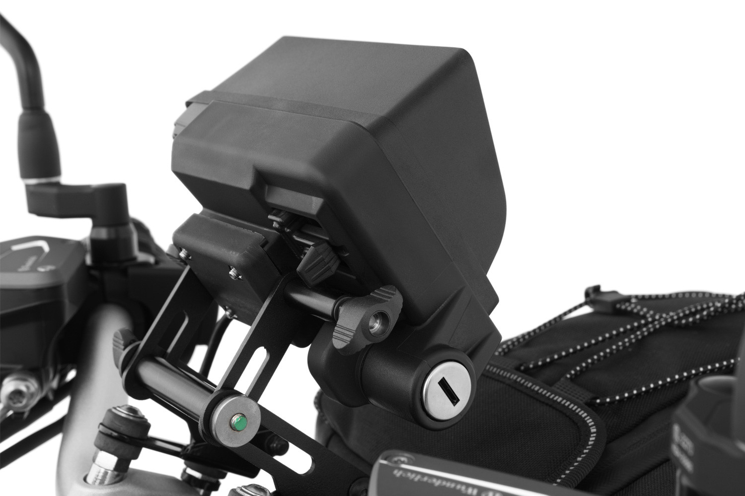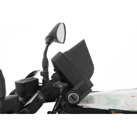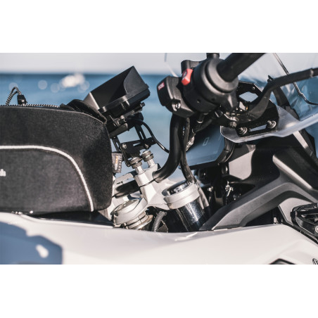 Originálny držiak navigačného systému na objímku riadidiel je celkom praktický, ale zlyhá pri použití tankvaku. Pri otáčaní sa navigačný systém zrazí s tankvakom.