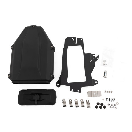Naša na mieru vyrobená skrinka na náradie ponúka ďalší úložný priestor pre všetky druhy užitočných drobností a dokonale sa integruje do výklenku medzi ľavým držiakom kufra EXTREME a zadným kolesom. Funkčný, robustný box je vybavený štyrmi pevnými závitovými vložkami a je bezpečne namontovaný na nosiči Wunderlich pomocou držiaka a zodpovedajúcich svoriek. Aby bola vždy zabezpečená dobrá dostupnosť, dá sa otvárať a zatvárať zozadu – dokonca aj s namontovanými puzdrami. Veko je zabezpečené proti strate. Box je vyrobený z kvalitného plastu, je vodeodolný a mimoriadne robustný.