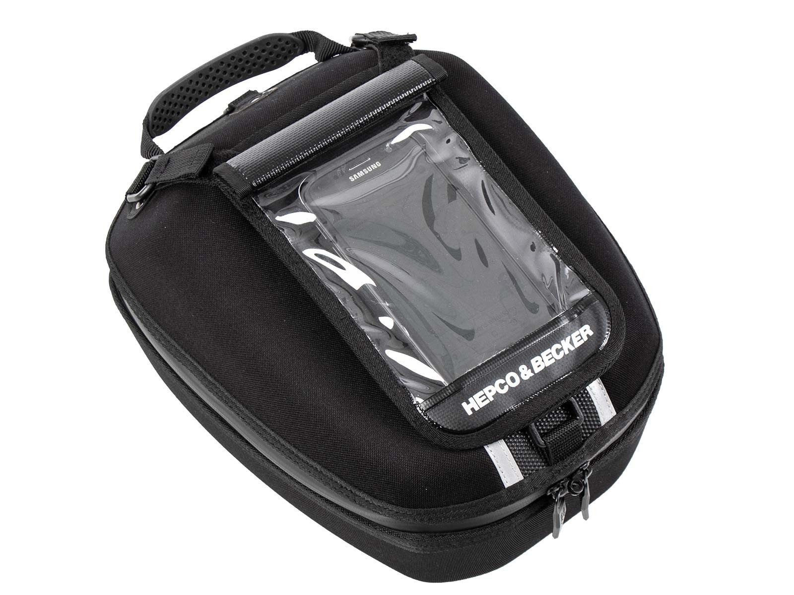 vodotesná taška na smartphone špeciálne pre tašku na nádrž Hepco & Becker „Street Daypack“ a „Royster“ Smartfón je možné ovládať cez kryt je pripevnená k vaku nádrže v 3 bodoch pomocou malého kľúča na suchý zips môžu byť odstránené v krátkom čase