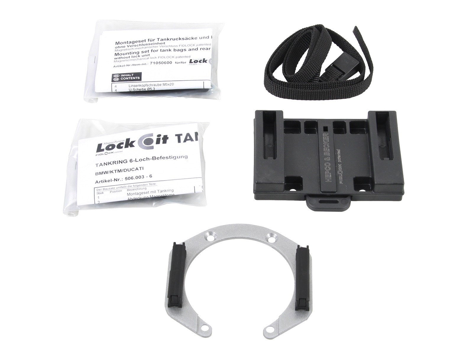 VLASTNOSTI: • Bezpečné držanie, mechanické / magnetické blokovanie • Ľahká manipulácia • Magnetické centrovanie • Jemný vzhľad • Jednoduchá, ale efektívna mechanika • Fidlock patentovaný • Tienené magnetické pole, bezpečné pre kreditné karty a elektronické zariadenia Tento pevný krúžok nádrže umožňuje pripojenie vrecka na nádrž Lock-it od spoločnosti Hepco & Becker. Súčasťou dodávky je krúžok nádrže Lock-it a protikus, ktorý je možné jednotlivo priskrutkovať k vaku nádrže, v závislosti od tvaru nádrže a uhla riadidiel. Aj keď je namontovaný krúžok nádrže, viečko nádrže sa dá bez problémov otvoriť. Spravidla potrebujete iba tento krúžok na nádrž a vak na nádrž od H&B a máte všetko, čo potrebujete. Každý krúžok nádrže špecifický pre daný model je obvykle uložený v príslušnom modeli motocykla. Ak nie je uložený žiadny krúžok nádrže, pomôžu tieto univerzálne krúžky nádrže.  absolútne bezpečné držanie, a to aj pri vysokých rýchlostiach mechanické / magnetické blokovanie Ľahká manipulácia Vak na nádrž je jednoducho zasunutý do zásuvky a vďaka magnetom sa automaticky uzamkne pomocou počuteľného cvaknutia Odomknutie: Mechanizmus sa odblokuje pomocou upevňovacieho popruhu na prednej strane vaku nádrže v smere jazdy; vak nádrže sa jednoducho vyberie Jednoduchá, ale efektívna mechanika