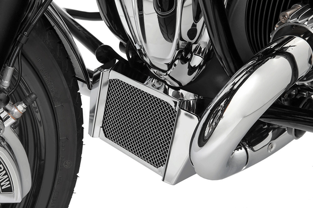 Štandardný kryt olejového chladiča BMW R 18 z plastu sa mnohým javí ako cudzie teleso v inak mimoriadne ucelenom poňatí. Vyvinuli sme elegantný kryt vyrobený výhradne z nehrdzavejúcej ocele s čiernym práškovým nástrekom, ktorý nielen zvýrazňuje vzhľad Big Boxera, ale zároveň chráni olejový chladič