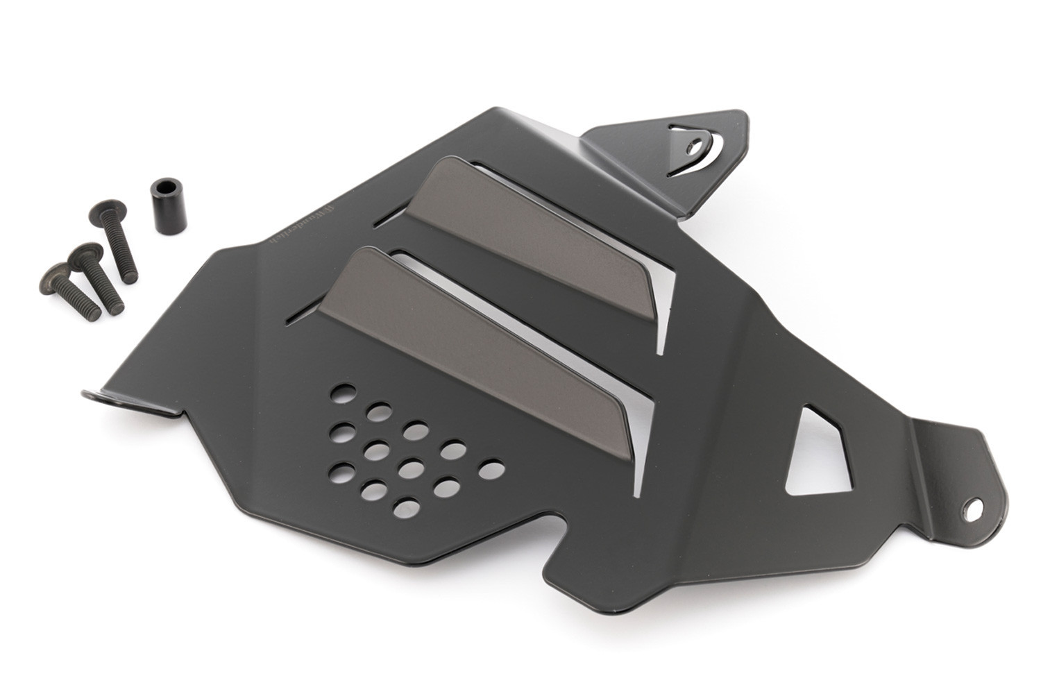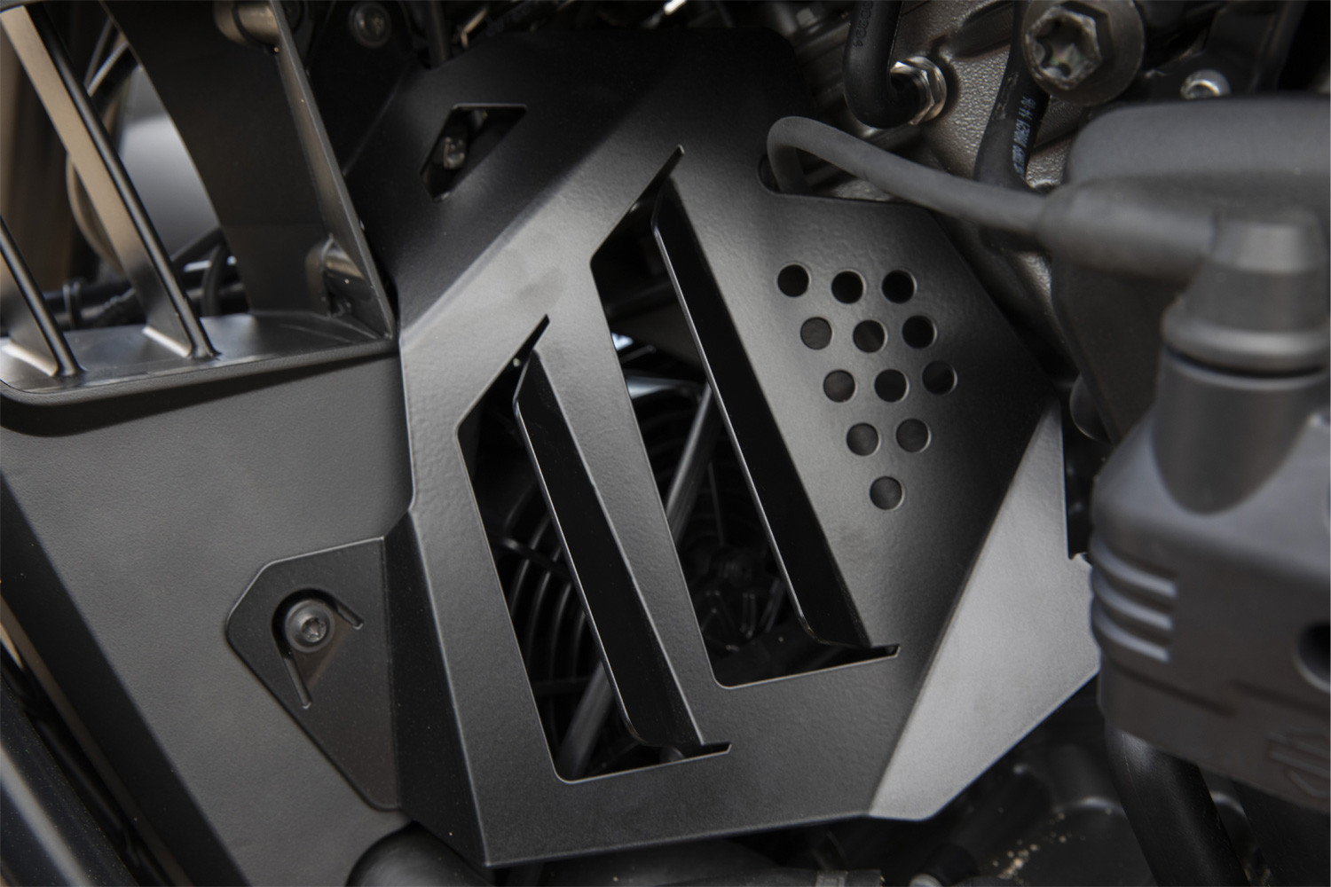 Krásne navrhnutý bočný kryt motora šikovne zakrýva to, čo mnohí považujú za nevábny pohľad na ľavú stranu motora. Tam môžete vidieť zadnú časť chladiča, ventilátor chladiča, množstvo káblov a vedení, ako aj vnútorné ozdobné prvky. Bočnica otvor opticky uzatvára a zároveň cez integrované prietokové otvory efektívne smeruje prúd horúceho chladiaceho vzduchu od chladiča a motora popri nohe vodiča – pretože by inak priamo zasiahol ľavú nohu vodiča. Spája tak efektívnu funkciu a celistvý dizajn, pretože dokonale ladí s ľavou stranou motora. Upevnenie sa uskutoční na existujúcich skrutkových bodoch.