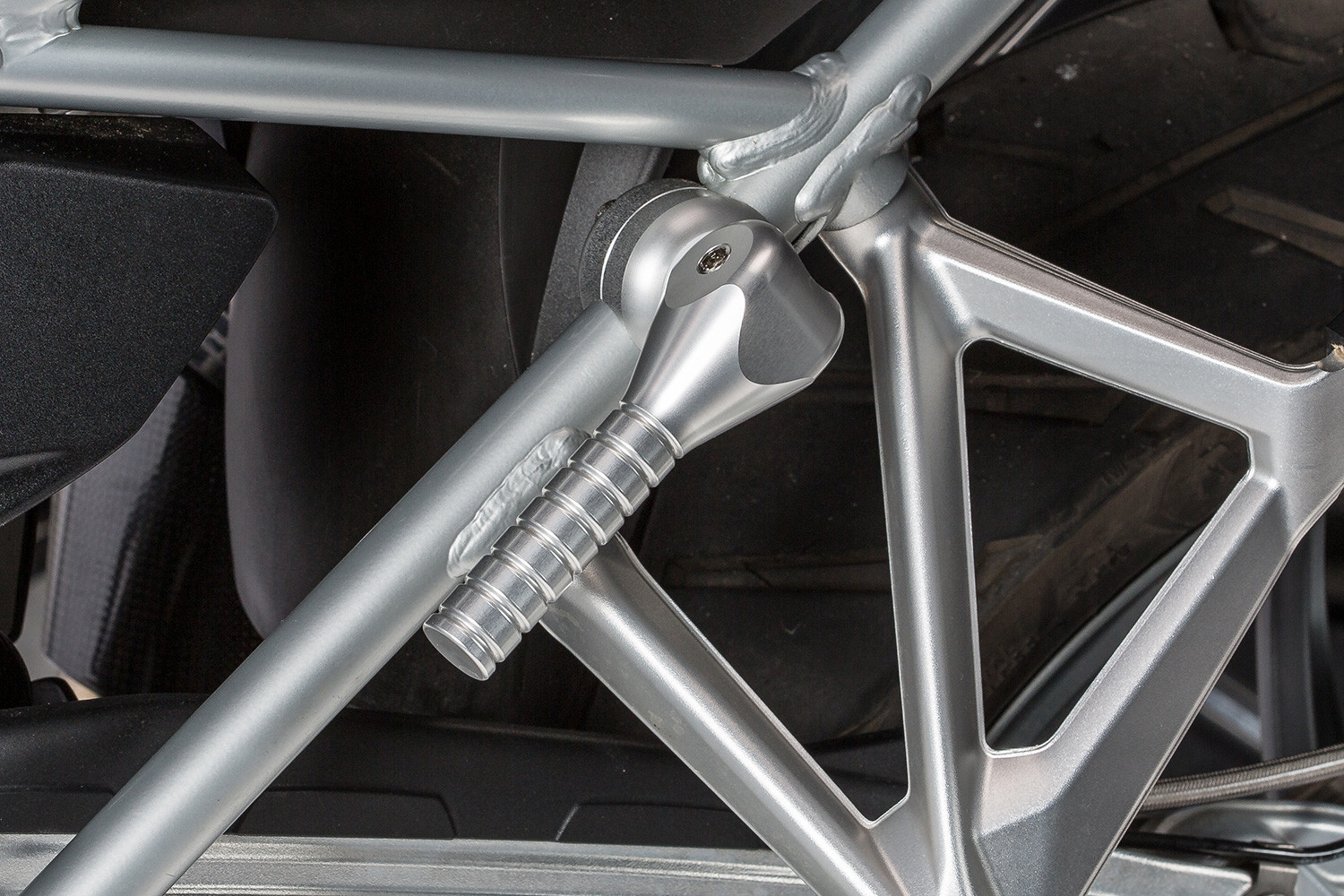 Veľmi, veľmi užitočný a ergonomický komponent. Optimalizuje pákový pomer - nielen pri plnom zaťažení stroja. Táto výklopná zdvíhacia rukoväť sa montuje naľavo od rámu pomocou pevnej konzoly na mieru. Dodatočné zariadenie proti skrúteniu, ktoré je zavesené na držiaku opierky nôh a nosiča, zaisťuje stabilné uchytenie. Po vyklopení sa stroj citeľne ľahšie a hlavne bezpečnejšie postaví na hlavný stojan, pretože protišmyková rukoväť dobre padne do ruky a prenesiete s ním podstatne viac sily ako na rámových trubkách, ktoré sú ťažko uchopiteľné alebo nie sú prístupné ani cez batožinu. Po zdvihnutí rukoväť nenápadne zmizne do svojej pokojovej polohy. Mechanizmus zaisťuje, že rukoväť je bezpečne zaistená v zloženej polohe.