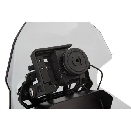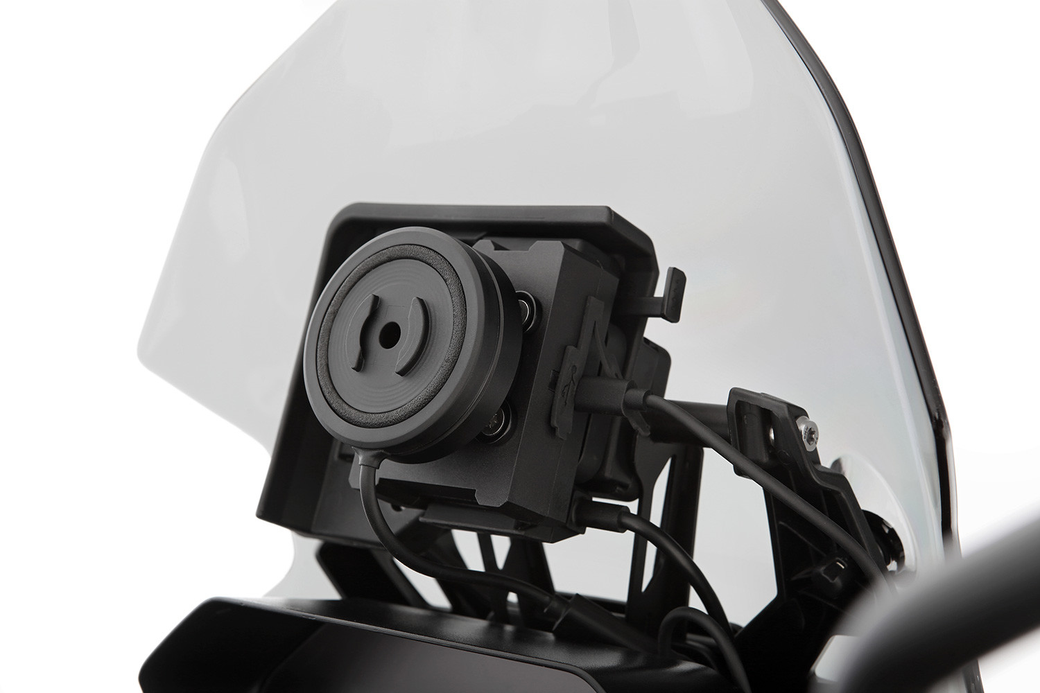 Centrálne umiestnený skrutkový závit slúži na uloženie nášho SP-Connect antivibračného modulu SPC+ s funkciou indukčného nabíjania, ktorý je súčasťou tejto sady. Antivibračný modul je inovatívnou odpoveďou na čoraz citlivejšie nové smartfóny. Tie pozostávajú z citlivých komponentov, ktoré by mohli byť ovplyvnené pretrvávajúcimi vibráciami od motora a podvozku. Antivibračný modul znižuje tieto vibrácie až o 60% vďaka efektívnemu tlmeniu špeciálne vyvinutej elastomérovej vložky. Po zaskrutkovaní možno modul použiť na uchytenie smartfónov. 60 centimetrov dlhý kábel funkcie indukčného nabíjania je vybavený konektorom USB-C a je možné ho pripojiť buď priamo do nabíjacieho boxu, alebo do palubnej zásuvky pre napájanie.