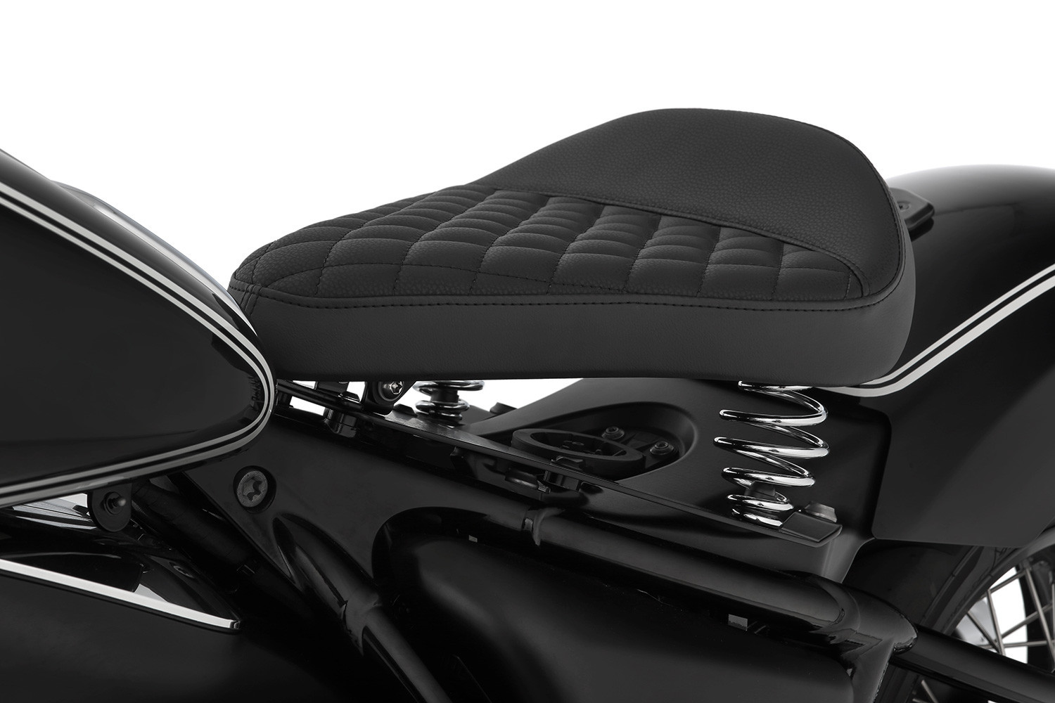 Ústredným a určujúcim detailom nášho konceptu „RockBob“ je bod, v ktorom vodič prichádza do kontaktu s bobberom: na hojdacom sedle. Ručne vyrobené, ergonomické sedlo je vyrobené z robustnej umelej kože. Jarné sedlo zo starej školy zdobí čiastočne aplikovaný, kosoštvorcový prelis nepremokavého poťahu. Vzhľad tohto prémiového pružinového sedla nevyhnutne pripomína obrázky legendy, BMW R 32.