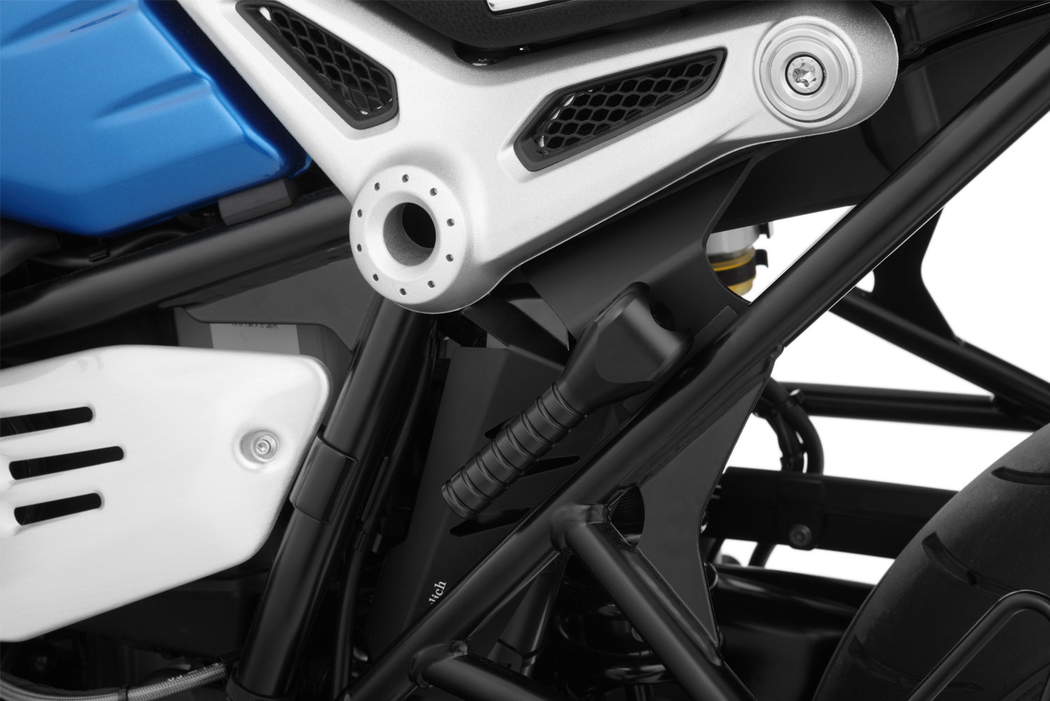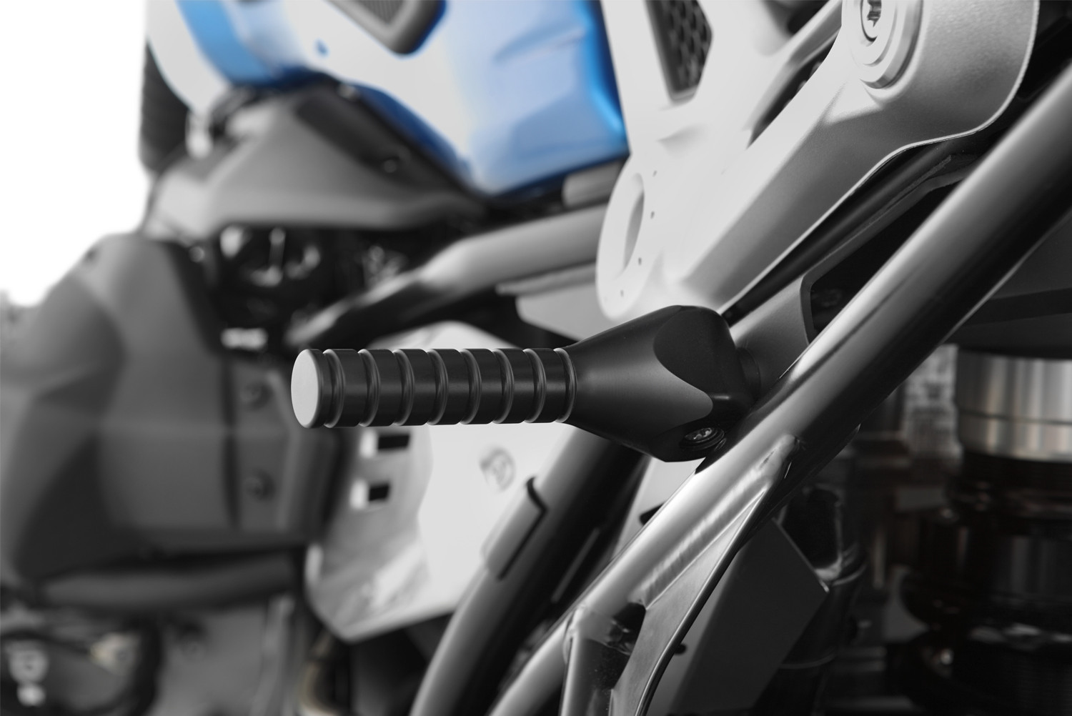 Veľmi, veľmi užitočný a ergonomický komponent, ak má váš R nineT stredový stojan. Optimalizuje pákový pomer - nielen pri plnom zaťažení stroja. Táto výklopná zdvíhacia rukoväť sa montuje na ľavý kolíkový rám spolujazdca pomocou pevnej konzoly na mieru. V rozloženom stave sa stroj výrazne ľahšie a bezpečnejšie postaví na hlavný stojan. Je to spôsobené tým, že protišmykový grip pohodlne padne do ruky a prenesiete podstatne viac sily ako na rámových trubkách, ktoré sú ťažko uchopiteľné alebo sa cez batožinu vôbec nedajú dostať. Po zdvihnutí rukoväť nenápadne zmizne do svojej pokojovej polohy. Mechanizmus zaisťuje, že rukoväť je bezpečne zaistená v zloženej polohe. Našu zdvíhaciu rukoväť vyrábame veľmi vysokej kvality z hliníka,