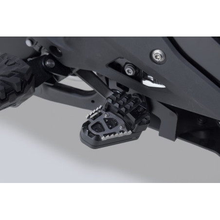 SW-MOTECH vyrábí tyto nástavce z vysokopevnostní frézované hliníkové slitiny; Vyznačují se černě eloxovaným povrchem a schůdkem z nerezové oceli. Pro optimální ergonomické nastavení lze zvýšení kroku brzdového pedálu nastavit ve dvou stupních po 22 nebo 27 milimetrech.