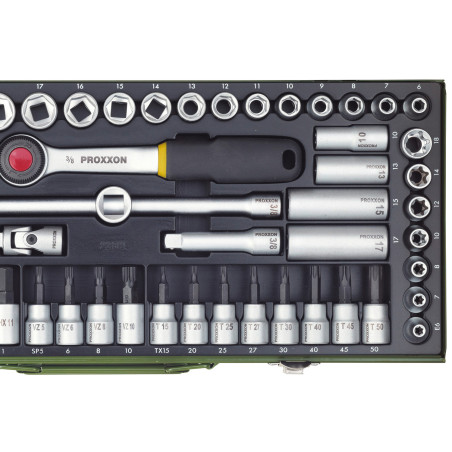 Vložky pre nástrčné kľúče od 6 - 24 mm. Hlboké sedlové vložky pre skrutky so závitom, ktoré vyčnievajú ďaleko 10 - 13 - 15 a 17 mm. Špeciálne vložky do zapaľovacích sviečok 14 - 16 - 18 a 19 mm. Štvorhranné skrutkovacie bity pre skrutky HX, TX a XZN. 8 lomených kľúčov: HX 1,25 - 1,5 - 2 - 2,5 a 3 mm, ako aj TX 6 - 8 a 10. Ďalší obsah viď obrázok.