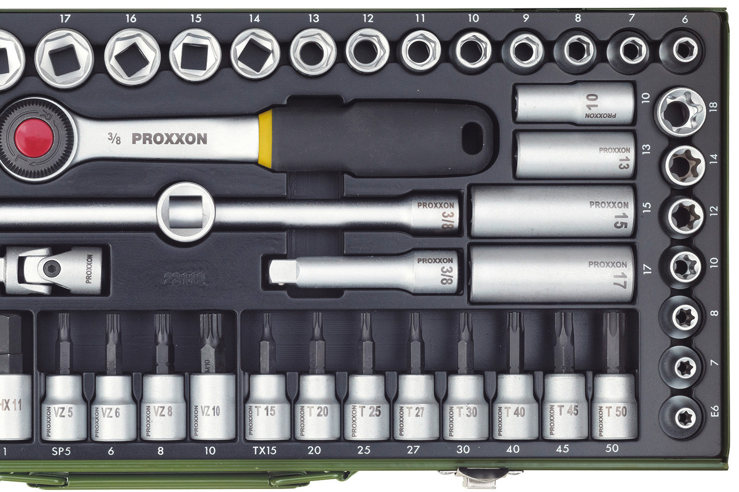V pevnej oceľovej krabici s práškovým nástrekom. S nezničiteľnou lisovanou vložkou odolnou voči skrúteniu zo vstrekovaného POLYPROPYLÉNU. Odolný voči olejom, kyselinám a ľahko sa čistí. S trvalo čitateľným označením pre všetky veľkosti kľúčov!