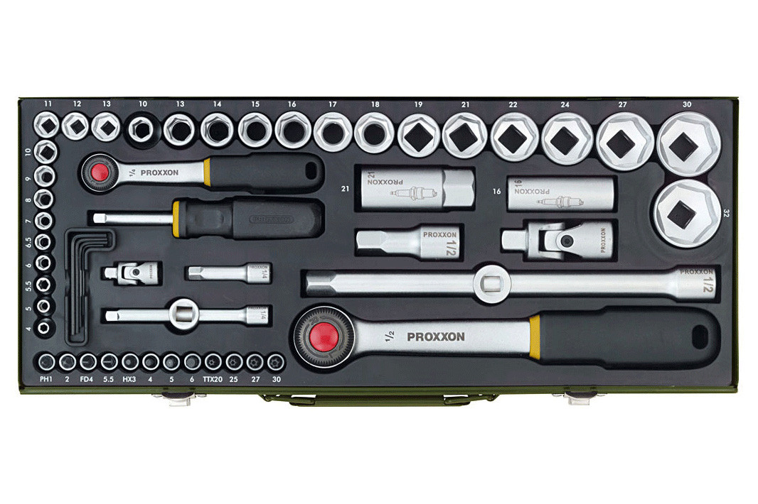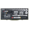Vložky pre nástrčné kľúče od 4 - 32 mm. Špeciálne vložky do zapaľovacích sviečok 16 a 21 mm. Skrutkovacie bity so štvorcovým pohonom pre skrutky s drážkou, skrutky Phillips, skrutky TX (s predným otvorom) a skrutky s vnútorným šesťhranom. Veľkosť imbusového kľúča (uhlový). 1,25 - 1,5 - 2,0 - 2,5 a 3,0 mm. Ďalší obsah pozri obrázok.