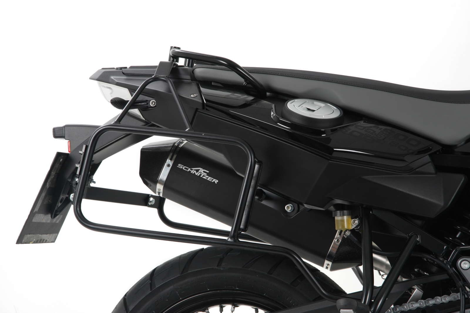 Asymetrický nosič bočných kufrov. Odporúčanie: použite užšie puzdro na strane tlmiča. napr. 30 ltr. & 40 ltr. v kombinácii. Bezpečne priskrutkovaný k rámu motocykla (žiadny systém Lock-it).