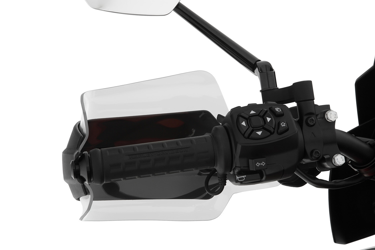Studené, vlhké alebo mokré ruky sú nepríjemné, rovnako ako nárazy kameňov, cestná špina akéhokoľvek druhu alebo striekanie hmyzu pri vysokej rýchlosti. S naším predĺžením chráničov rúk sme výrazne zväčšili ochrannú zónu pôvodných chráničov na výšku aj na šírku a predĺžili sme ju aj smerom von na strane okolo ruky až po koniec riadidiel. Nemôžete získať žiadnu ďalšiu ochranu, ale určite by ste mali mať túto úroveň ochrany. Tieto opatrenia nám umožnili výrazne zlepšiť účinnosť ochrany. Horný okraj sme vybavili vodoodpudivým golierom, ktorý sa rozširuje smerom von; odvádza striekanú vodu smerom von a necháva ju stekať po stranách. Priehľadný dizajn je funkčný a atraktívny.