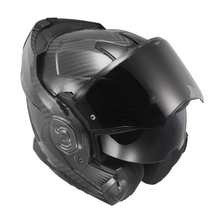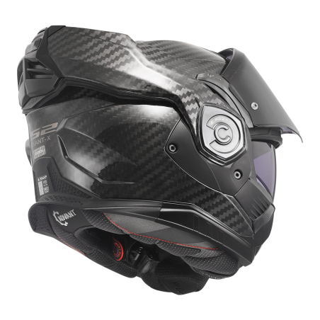 Špičková karbónová cestovná preklápacia helma najvyššej triedy, integrovaná slnečná clona, vylepšený mechanizmus preklápania o 180 stupňov, ľahko vyberateľné plexi s úpravou proti poškriabaniu, vetranie s uzatvárateľnými vstupmi, príjemný vyberateľný a prateľný antialergický interiér X-Static s obsahom lícnic, fólia Pinlock 70 Max Vision v cene, 1550g
