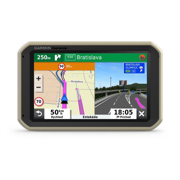 V TERÉNE AJ NA CESTE7” farebný dotykový displej ponúka podrobné navigačné pokyny pre jazdu po cestách v Európe, Afrike a na Blízkom východe a topografické mapy na navádzanie v teréne. Obsahuje internú 64GB pamäť pre stiahnutie doplnkových máp TOPO.VOJENSKÁ ODOLNOSŤNavigácia Overlander spĺňa americký vojenský štandard 810 odolnosti proti vysokým teplotám a nárazom. Je možné ju namontovať prakticky kamkoľvek vďaka napájanému magnetickému držiaku s prísavkou a 1” guľovému adaptéru s doskou AMPS, ktorá je kompatibilná s montážnymi systémami RAM.KRYTIE PROTI PRACHU IP5XNevyhnutná výbava pre jazdu v teréne, ktorá je od základu, vrátane obvodovej dosky, navrhnutá pre odolnosť voči prachu a extrémnym teplotám.GARMIN EXPLOREPomocou Garmin Explore je možné synchronizovať trasy a waypointy medzi satelitnou navigáciou Overlander™, telefónom a počítačom. Umožňuje ľahký import a export súborov GPX do služby Garmin Explore – dokonca aj offline.TOPOGRAFICKÉ MAPYNavigácia Overlander obsahuje prednahrané topografické mapy Európy, Blízkeho východu a Afriky. Doplnkové topografické mapy celého sveta môžete sťahovať do interného 64GB úložiska.DATABÁZA KEMPOVNavigácia Overlander obsahuje prednahrané databázy iOverlander, ACSI, Campercontact a Trailer's PARK POI, takže ani nepotrebujete mobilný signál, a predsa neomylne trafíte aj k odľahlým prírodným táboriskám.PRISPÔSOBENIE PODĽA VOZIDLACestnú navigáciu je možné prispôsobiť rozmerom a hmotnosti vášho terénneho vozidla a navyše budete dostávať upozornenia na výškové a hmotnostné limity mostov, ostré zákruty, prudké stúpania a ďalšie riziká na trase.SATELITNÝ PRÍJEMPodpora systémov GPS, GLONASS a Galileo vám pomôže so sledovaním trás v zložitom teréne lepšie ako samotný systém GPS.NÁSTROJE NA NAVIGÁCIUTeraz máte v jednom zariadení k dispozícii všetko vybavenie na cestovanie v teréne, napríklad vstavaný kompas, výškomer a barometer.Fyzické a výkonnostné dátaVeľkosť displeja 6.0" W x 3.5" H (15.2 x 8.9 cm); 6.95" (17.7 cm)Rozlíšenie displeja 1024 x 600 pixelsGPS ÁnoFyzické rozmery 7.84" W x 4.79" H x 0.93" D (19.9 x 12.2 x 2.4 cm)Stupeň vodotesnosti NieHmotnosť 15.4 oz (437 g)Výdrž batérie až 3 hodinyMapy a navigáciaPredohrané uličné mapy Áno