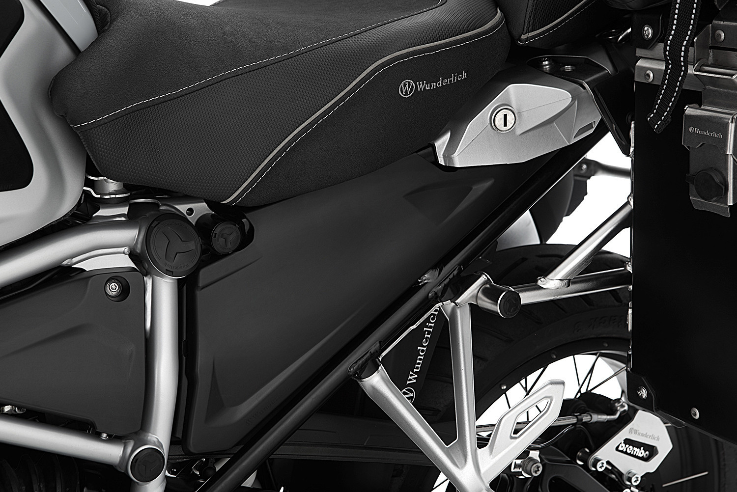 Dve polovice kapotáže tesne uzatvárajú dve bočné otvory zadnej časti rámu. Vírivé nečistoty, kamenné triesky, striekajúca voda alebo sprej sa účinne zhromažďujú alebo odvádzajú skôr, ako sa dostanú k vodičovi a spolujazdcovi. Kontaminácia stroja je znateľne znížená. Dynamický dizajn vďaka drážkam zostáva diskrétny a na motocykli vyzerá nenápadne a harmonicky. Montáž a demontáž sú veľmi jednoduché.