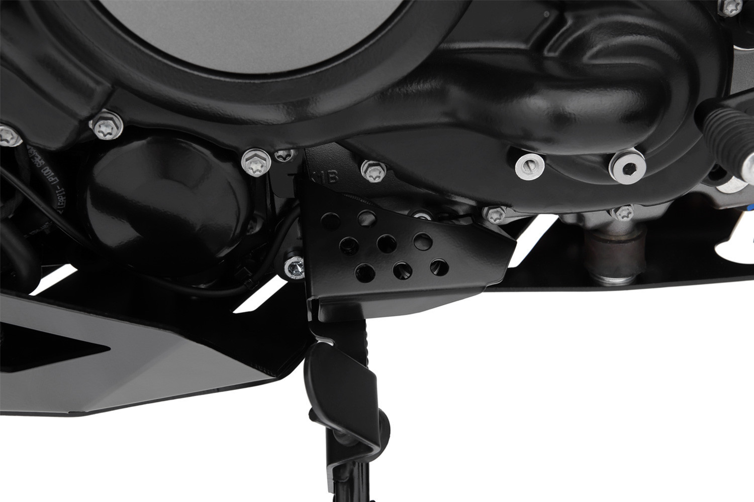 Mnohým smútkom už zabránil vypínač, ktorý pri vyklopení bočného stojana spoľahlivo odreže zapaľovanie. Pretože rozjazd s vyklopeným bočným stojanom môže mať pre vodiča aj stroj veľmi nepríjemné následky. Preto má zmysel správne chrániť odkrytý spínač pred poškodením spôsobeným kamienkami alebo pádmi. Pretože ak je spínač poškodený, motor už nenaštartuje. Vysoká úroveň ochrany vyplýva z tuhosti šikmého 2 mm hliníkového plechu s dvoma diskrétnymi pozdĺžne vyfrézovanými otvormi. Rámuje odkrytý spínač stabilným dvojbodovým uchytením a bezpečne ho chráni. To spoľahlivo znižuje riziko poškodenia spínača, najmä pri použití v teréne.