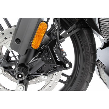 S naším krytom na mieru spoľahlivo chránime regulačný ventil a znižujeme riziko poškodenia kameňmi, konármi alebo inými cudzími predmetmi, pretože porucha môže mať nepríjemné následky. Ochranný kryt má hrúbku pevného materiálu 2,5 mm. Trojrozmerný tvar a presné lemovanie vysoko kvalitného krytu z nehrdzavejúcej ocele prispievajú k konštrukčnej tuhosti komponentu. Perforácia zdôrazňuje dobrodružný vzhľad a znižuje hmotnosť krytu. Je presne priskrutkovaný a tvarovo prilieha k ľahko prístupnému prednému ľavému brzdovému strmeňu - ktorý dodatočne chráni - a tak sa diskrétne integruje.