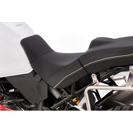 Naše sedadlá pre jazdcov vyrábame s charakteristickým, ergonomickým 3D obrysom, ktorý umožňuje jazdcovi splynúť s jeho motocyklom. Tvar a sklon náročne vypracovaného jadra lavičky podporuje ergonomicky výhodnú, prirodzenú polohu panvy. Takto integrovaný do motocykla je ľahké jazdiť uvoľnene a teda aktívne. A uvoľnené sedenie nepochybne zvyšuje pasívnu bezpečnosť. Táto lavica ACTIVE COMFORT je vybavená najnovšou technológiou Thermo Pro , čo znamená, že teplota sedadla je na horúcom slnku uprostred leta až o 25 °C nižšia v porovnaní s bežným poťahovým materiálom. V našom sortimente máme zodpovedajúce sedadlo spolujazdca.