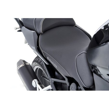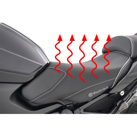 Naše sedadlá vyrábame s charakteristickým, ergonomickým 3D obrysom, ktorý umožňuje jazdcovi splynúť s motocyklom BMW. Tvar a sklon náročne vypracovaného jadra lavičky podporuje ergonomicky výhodnú, prirodzenú polohu panvy. Takto integrovaný, je ľahké jazdiť uvoľnene, a teda aktívne. A uvoľnené sedenie nepochybne zvyšuje pasívnu bezpečnosť. S našimi sedadlami vodiča a spolujazdca ThermoPro je teplota povrchu sedadla uprostred leta na páliacom slnku až o 25 °C nižšia v porovnaní s bežným poťahovým materiálom. V našom sortimente máme zodpovedajúce sedadlo spolujazdca.