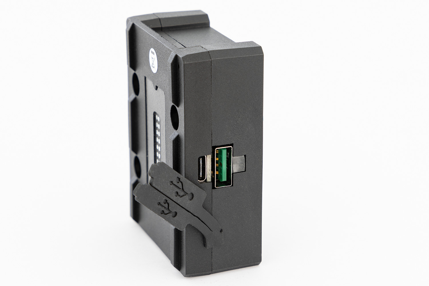 Má dva porty USB typu USB 3.1 typu A a USB 3.1 typu C na pravej strane krytu, ktoré spĺňajú štandardy pre porty rýchleho nabíjania QC 3.0 a QC 4.0 (QC = Quick Poplatok). splniť. Aktivitu nabíjacieho boxu signalizuje modrá LED kontrolka, ktorá je dobre viditeľná hneď nad dvomi USB slotmi.