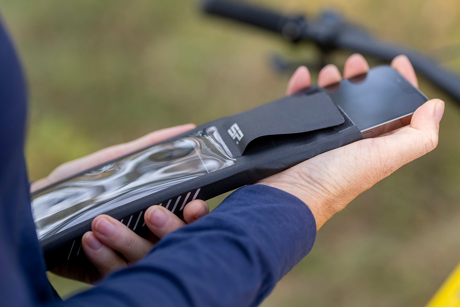 Zasuňte smartfón do puzdra, otvor zrolujte a zaistite povrchom na suchý zips. Fleecová vložka bez škrabancov a nalepovací EVA rám umožňujú nájsť perfektnú polohu pre mobilný telefón.