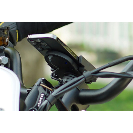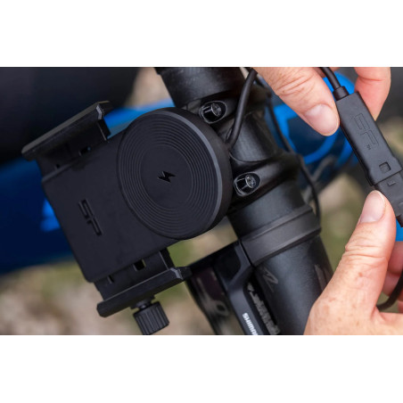 Nabíjací držiak tiež podporuje bezdrôtové nabíjanie. Jednoducho napájajte indukčnú nabíjačku cez motor, batériu e-biku alebo powerbanku a bezdrôtovo nabijete svoj mobilný telefón. Prázdna batéria na cestách? Odteraz už bez možnosti.