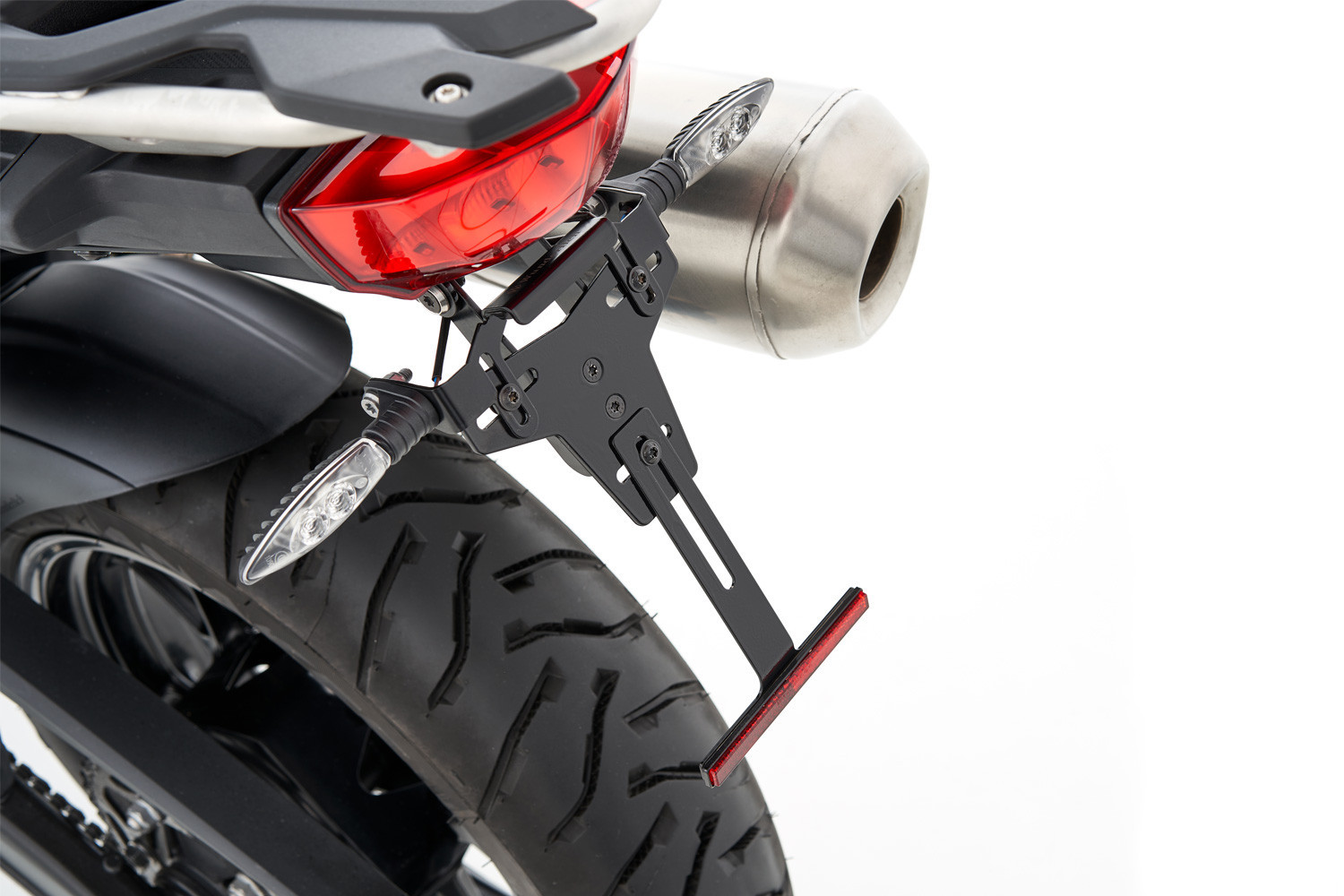 Dlhý držiak ŠPZ modelov F 750/850 GS, ktorý vyčnieva dozadu, pôsobí v kombinácii s DIN reflektorom trochu mohutne. Naša zadná prestavba v podstate pozostáva zo zadného obloženia na spodnej strane a držiaka ŠPZ.