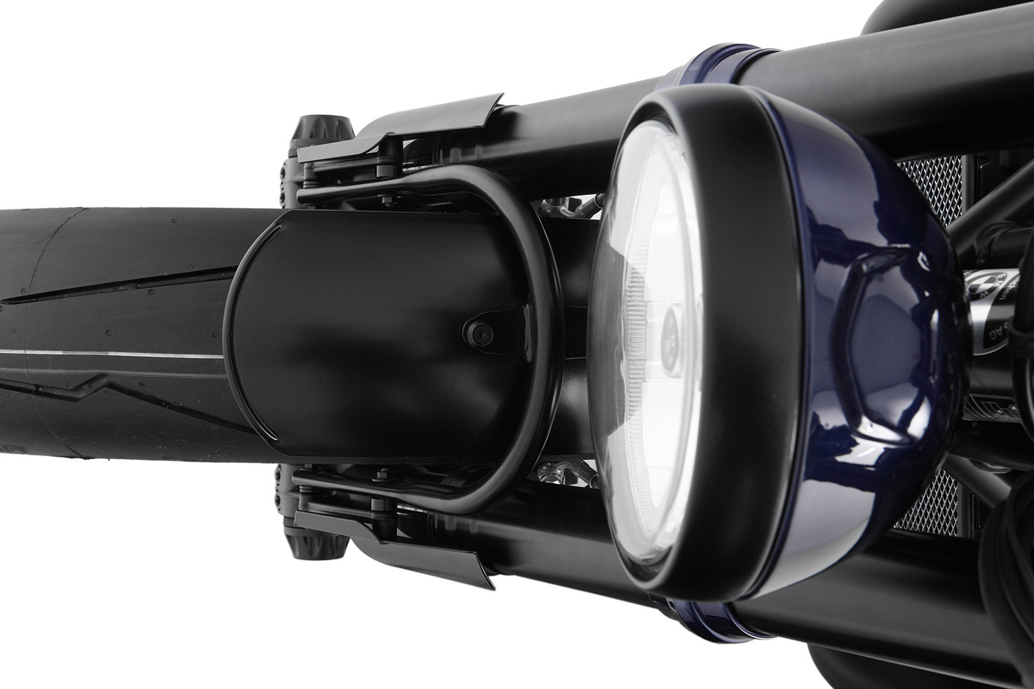 Tento krátky, krásny blatník predného kolesa vyrobený z hliníka s čiernym práškovým nástrekom je skutočným pútačom: dáva modelu R nineT nový, nápadný a veľmi individuálny vzhľad prednej časti. Vo vysokej verzii je ušľachtilý blatník pripevnený k držiaku lampy pomocou dvoch čiernych prídržných dosiek s práškovým nástrekom. Nízka verzia je pripevnená k pôvodným držiakom pomocou čierno potiahnutej rúrkovej montážnej konzoly. Ľahký, ale vysoko stabilný.