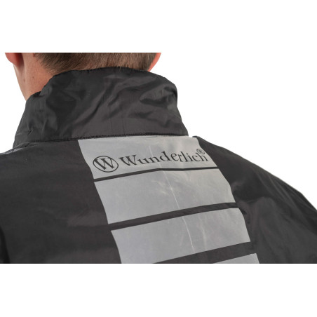 Bunda do dažďa má na pravej strane uzatvárateľné vrecko s chlopňou a integrované vnútorné vrecko. Zips je odolný voči búrke uzavretý veľkorysým, reflexným pásom proti vetru. Nákrčník a sťahovanie na spodnom leme umožňujú individuálne a pohodlné nastavenie šírky krku a pása. Šírka rukávov sa dá nastaviť pomocou dvoch pásikov na suchý zips na ľavom a pravom rukáve tak, aby sa nič nevlalo. Tyče sú vybavené reflexnými prvkami. Vlastnosti dotvárajú viacdielne reflexné pásiky na zadnej strane. Vnútorná podšívka z ľahko udržiavateľnej a nekrčivej sieťoviny vždy zaisťuje príjemnú klímu v bunde. Rovnako ako samotná bunda, aj vnútorná podšívka je rýchloschnúca. Kompaktná veľkosť balenia a súvisiaca úložná taška vám umožní nosiť bundu vždy so sebou.