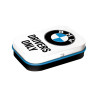Štýlová krabička na tabletky pre motocyklistov BMW, naplnená lahodnými, osviežujúcimi tabletkami mäty piepornej. Pevná krabica je vyrobená z oceľového plechu a veko je vyrazené. Keď je prázdny, je príliš dobrý na vyhodenie a je dobré ho použiť na ventily pneumatík, pružiny alebo iné drobnosti na cestách.