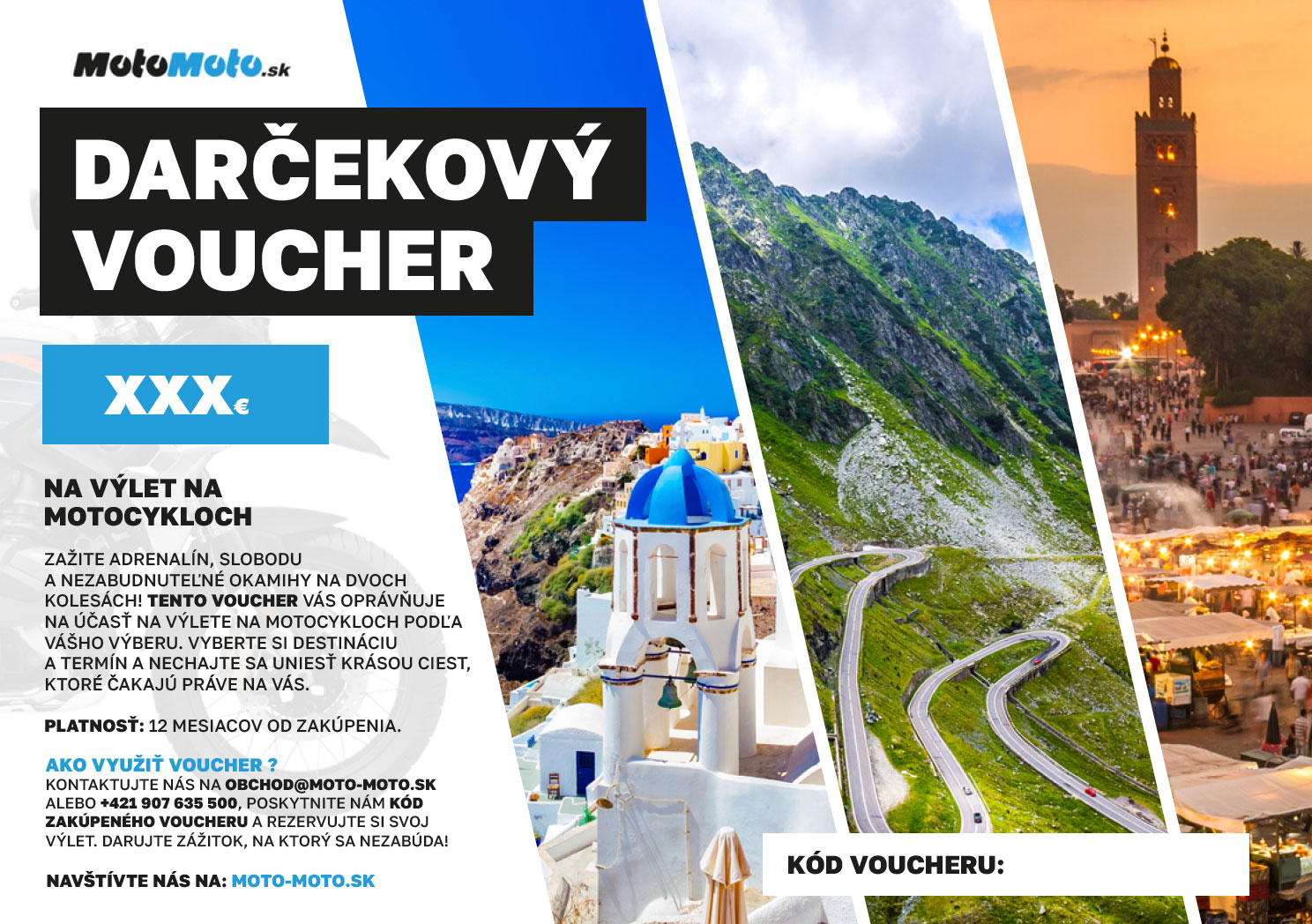 Následne, ak si ho chcete uplatniť, napíšte e-mail na obchod@moto-moto.sk alebo zavolajte na číslo +421 907 635 500, nadiktujte kód voucheru a dohodnite sa na termíne a výlete podľa vášho výberu.