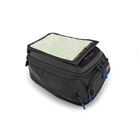 Kvalitná a prepracovaná taška na tablet a mapu je ideálnym doplnkom k našim tankvakom CLICK BAG a ponúka praktické riešenie pre klasickú mapovú alebo digitálnu navigáciu. V kompaktnom formáte DIN A5 (148 x 210 mm) sa univerzálne hodí na tankvaky CLICK BAG vo veľkostiach 6, 11, 13 a 16. Veľké priehľadné okienko je vyrobené z robustnej technickej fólie odolnej voči poveternostným vplyvom, ktorá umožňuje nielen presné ovládanie dotykových obrazoviek, ale je aj trvalo odolná voči žltnutiu, trvácna a udržateľná vďaka vysokej UV stabilite. Nabíjací kábel na napájanie tabletu možno pretiahnuť cez oválny labyrintovitý otvor, ktorý je na spodnej strane.